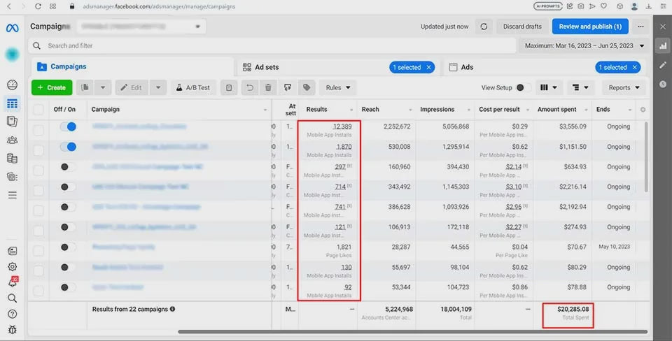 Between Mar – Jun 2023, this campaign generated over 12,389 mobile app installs while reaching more than 5.2M people and delivering 18M impressions. With a total spend of $20,285, the campaign successfully scaled user acquisition at a cost-effective rate, driving consistent installs across multiple ad sets. This highlights the power of Facebook Ads in accelerating mobile app growth and user acquisition.